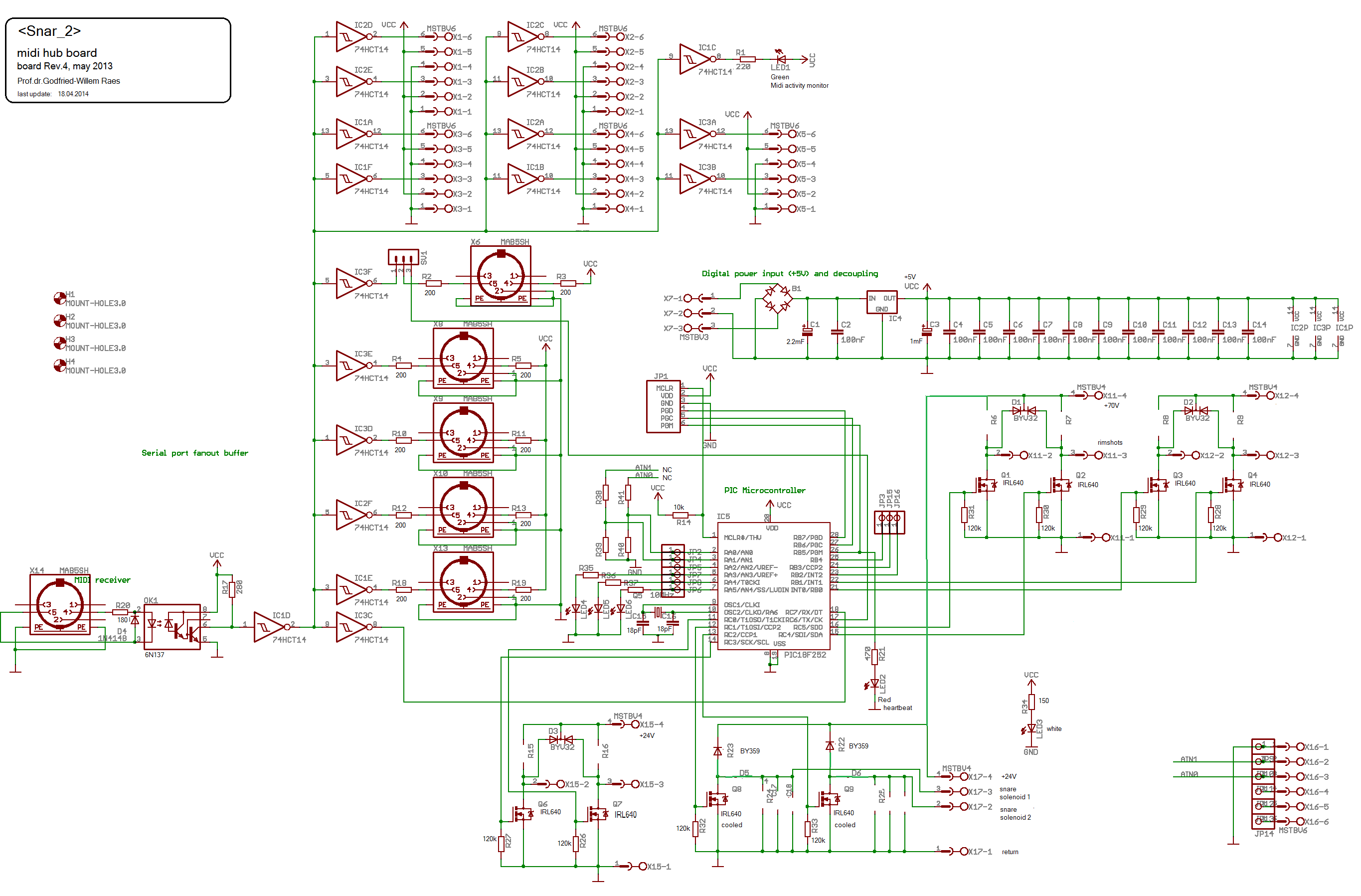 - PIC1: 18F2525-I/SP (steers the two snare solenoids, the two rimshots and
