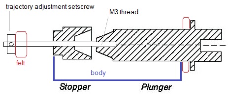 5.1 mm, maximum traject 17.8 mm. Length:39 mm, Plunger: 15.3 g. Total weight: