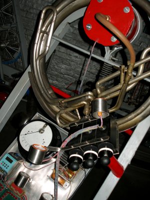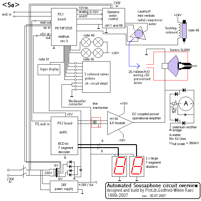 In het M&M robot orkest hadden we behoefte aan wat meer variatie in de heel lage basinstrumenten, niet in het minst voor de verklanking van de opening van mijn apero <Technofaustus>. Alleen de <player piano>, <bourdonola> en <Qt> beschikken over een in de laagte redelijke bas. Nu is het maken van lage instrumenten op zich eigenlijk technisch eenvoudiger dan hoge vanwege de geringere eisen gesteld aan de precizie bij de bouw, maar, de afmetingen ervan swingen werkelijk de pan uit. Om midi noot 24 voort te brengen met open luchtkolommen bvb., heb je gauw een bouwhoogte nodig van ca. 6 meter... Tongwerken anderzijds klinken wanneer ze klein worden gemaakt, gauw erg nasaal en uiterst boventoonrijk, waardoor ze niet goed als dragende bassen aan te wenden zijn. De bezoekers van de <M&M> koncerten zullen dit ook wel al hebben opgemerkt bij het horen van de klanken van <Vox Humanola> en van <Krum>. Vandaar het idee om werk te maken van een geautomatiseerde bastuba. Een tuba, het instrument bij uitstek voor de verzorging van sterke dragende bassen, hadden we wel niet in onze instrumentenverzameling, maar een (helaas erg versleten) Sousafoon, ooit eens op de rommelmarkt gekocht voor een prikje, hing nog ergens in onze traphal sierraad te wezen. Nadere inspektie leerde ons dat het om een Sib instrument ging voorzien van 3 ventielen. Automatisering van die ventielen bleek een erg eenvoudige klus, maar het vinden van een adekwaat klankvormingsmechanisme had heel wat meer voeten in de aarde. Na heel wat research met namaaklippen in rubber, silikonen en neopreen, kleppen in koper, mica en teflon, kwamen we terecht bij een reeds in de 19e eeuw bekend mechanisme voor toonopwekking: dat van het diaphane register in sommige britse orgels. Het toongat, in ons geval het mondstuk van de sousafoon, wordt daarbij door een zachte en juist sluitende klep heel erg snel geopend en gesloten. Dat klinkt zo'n beetje zoals je met de palm van je hand op het mondstuk slaat: een zachte slaptongue op het instrument. Nu was het zaak deze klep tegen de juiste snelheid, overeenkomstig de resonantiefrekwentie van het instrument, te laten trillen. Elektromagneten bleken hopeloos te traag: we haalden nooit snelheden groter dan ca. 40Hz. Dan maar de zaak omgekeerd aangepakt: vaste magneet en lichte beweeglijke spoel. Zo hadden we ei zo na opnieuw de luidspreker uitgevonden natuurlijk... Hier echter, wordt niet een membraan in beweging gebracht door de spoel, maar uitsluitend de in silikonenrubber uitgevoerde afsluitklep voor het mondstuk. Deze klep vormt eigenlijk het equivalent van de lippen waarmee het mondstuk bespeeld wordt. Dit bleek prima te werken en liet ons de mogelijkheid ook lucht opgewekt door een radiale kompressor aan de achterzijde toe te voeren. De sousafoon wordt op die wijze ook echt aangeblazen. De pedaalnoten (midi 15 tot 22) bleken met ons op deze wijze opgebouwd artificieel hoofd uitstekend speelbaar: voor menselijke spelers zijn die tonen zo goed als onhaalbaar). Alleen om snel van lage naar hoge noten te kunnen overgaan, konden we geen snel genoeg reagerend drukventiel verzinnen. De radiale kompressor is weliswaar in druk regelbaar gemaakt, maar door de inertie van de schoepen, reageert die eerder traag op winddrukkommandos. De tessituur zal dus beperkt blijven tot de diepere regionen van de muziek (tot hooguit, en niet zonder moeite, midi noot 47).