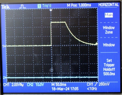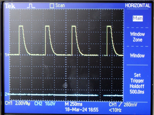 Het effekt van deze schakeling is goed te zien op dit oscilloskoopplaatje: