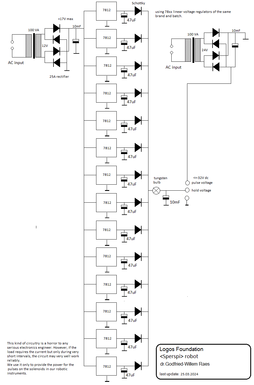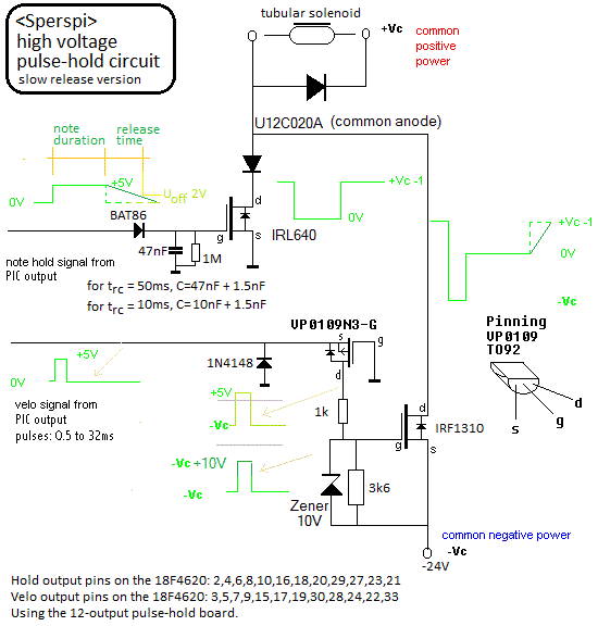 Na lang beraad en heel wat proeven beslisten we om voor de automatisering uiteindelijk toch voor een Vorsetzer-ontwerp te gaan. Om het probleem van de lawaaierige terugval van de spoelkernen en de toetsen op te lossen, brachten we enkele wijzigingen aan in het schakelschema van ons beproefd ontwerp voor aanslaggevoelige toetsinstrumenten. De mosfet die instaat voor het ingedrukt houden van de toets wordt op zijn gate voorzien van een kondensator en een 1 MOhm ontlaadweerstand. De gate wordt geschakeld via een BAT86 Schottky diode. Hierdoor verloopt het lossen van de kern bij het uitschakelen van de Mosfet geleidelijk. Opgelet moet nu wel worden voor de dissipatie, want traag schakelen gaat uiteraard gepaard met vermogensverlies over de Mosfet die dan immers in zijn lineair gebied moet werken.
