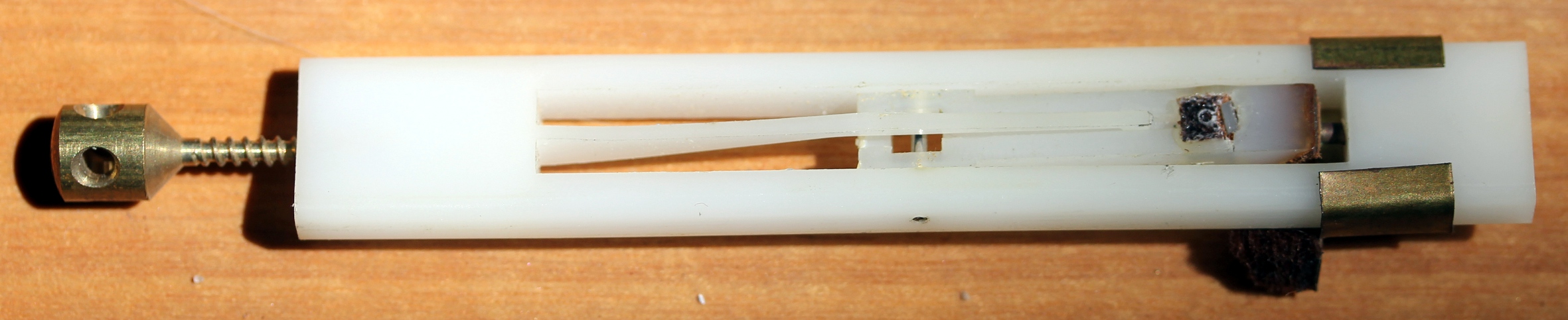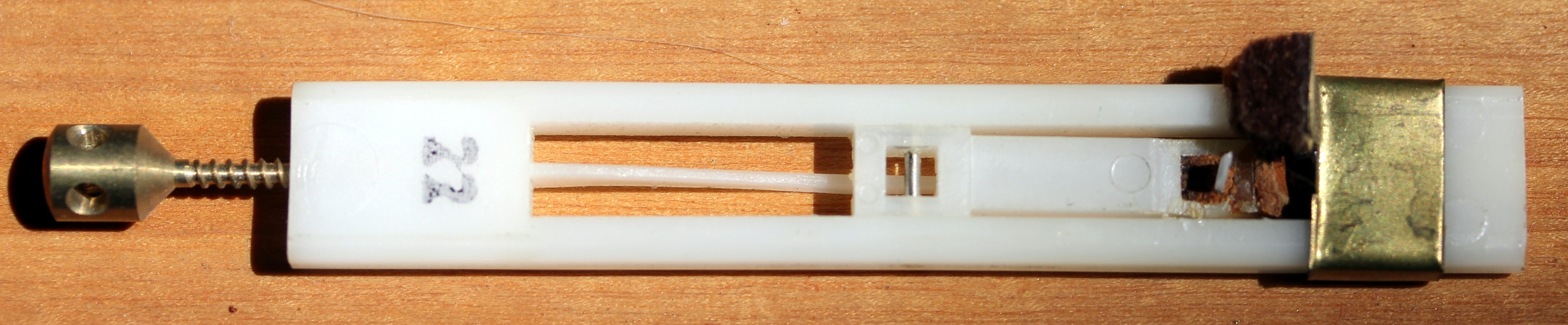 Puur technisch gesproken, bestaat de beste oplossing erin de dokjes van onderuit met de elektromagneten omhoog te duwen op de plaats waar de toetsen dan nu doen. Daarvoor moet het hele keyboard blijvend weggenomen worden. Maar, zonder toetsenbord wordt het wel moeilijk tot omslachtig om het spinet te stemmen, want om dat dan te doen zouden we telkenmale een midi-keyboard ofwel een komputer met midi-interface moeten aansluiten. Snel wat bijstemmen is dan niet meer aan de orde. Ook de alternatieve mogelijkheid om de dokjes aan hun bovenkant met elektromagneten omhoog te trekken bestudeerden we grondig. Bezwaren daartegen zijn enerzijds dat het schroefje waarmee de demper op het dokje wordt afgeregeld dan niet meer bereikbaar is. In het gat voor die regelschroef moeten we immers draad tappen waarmee het dokje aan het anker van de elektromagneet wordt bevestigd. Een tweede bezwaar is dat het erg moeilijk wordt om het mechanisme te verwijderen en terug te plaatsen. De ankers zitten immers vast op de dokjes en de spoelen moeten dan met zijn allen (50) tegelijk en in register over de ankers worden geschoven... voorwaar geen sinecure.