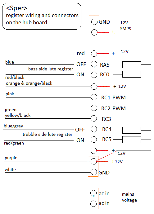 RA5 en RC5 besturen de baskant van het luitregister, terwijl de diskant zijde