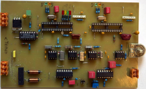 2. Sound generator board: This board steers the 75 Watt motor compressor horn driver via a digital audio amplifier module. A 16-bit processor is used to generate the required waveform and two analog multipliers are used for envelope shaping and amplitude modulation. Thus we could maintain audio resolution even at the lowest soundlevels. Handling this in the full digital domain would have required a fast 32-bit processor. The analog dynamic formant filter also found a place on this board.