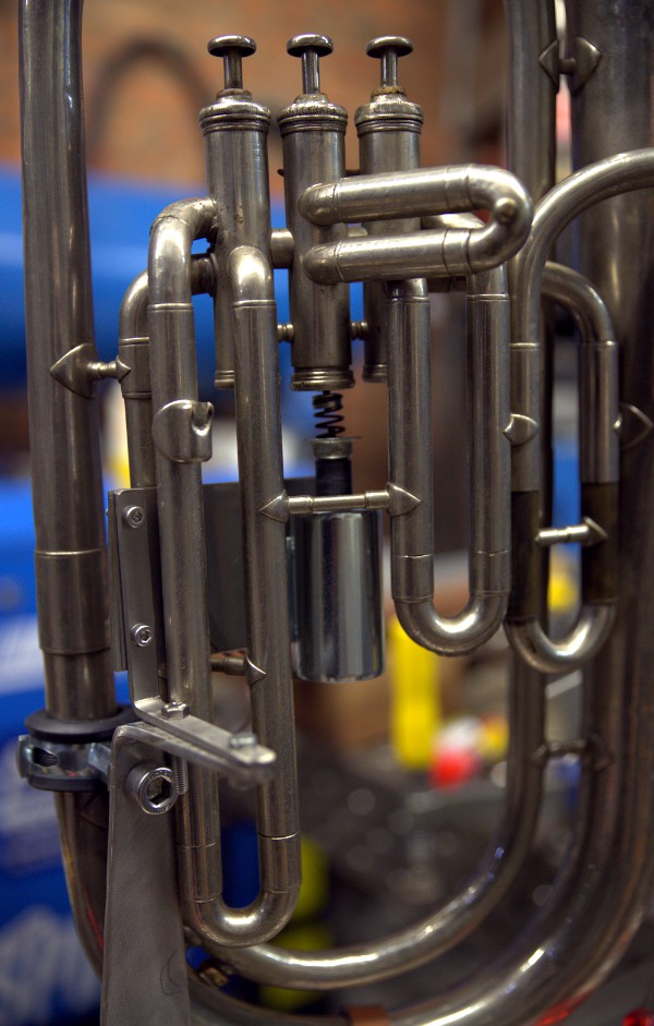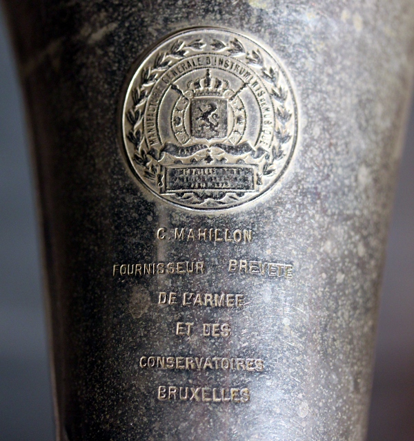 When starting the design and construction of this musical robot, we could build further on the experiences gained through the realization of quite some automated brass instruments build since 1999: <So>, a sousaphone, <Korn>, a cornet, <Heli>, a helicon, <Bono>, a valve trombone and <Horny>, a French horn, <Bug>, a fluegelhorn, <Hunt>, a hunting horn, <Trumpeter> and <Cornalto>, the latter two made on request for Alain Van Zeveren. Musically speaking the cornet, the flugelhorn as all saxhorns are very similar instruments, differing only in the range and the timbre they produce. They all have a conical bore and are said to sound more mellow than the trumpet, the trombone and other brass instruments with a cylindrical bore. The ambitus of the tenor saxhorn (often also called a baryton horn) however is considered to be quite a bit more limited, the lowest notes being never used. The textbooks mention 2 1/2 octaves at the most. The tenor is in fact not really a horn, although called tenorhorn ('tenorhoorn' in Dutch), but a saxhorn like the tuba. The instrument we started off with is made by Charles Mahillon (1841-1924) and it came in out possesion in 1983, when we bought it on the Ghent flea market. It was in a reasonable shape although it must have undergone some changes and (poor quality) resoldering works, as we found it to be tuned to A 440Hz, quite impossible taking into account the time it was originally constructed. For sure after 1878 and before 1924.