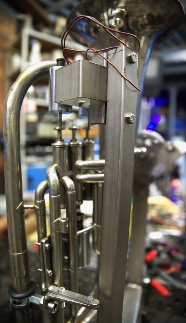 Wat de automatisering van dit instrument bouwden we verder vanuit de ervaringen opgedaan met de robots <Trumpeter> en <Cornalto> die we bouwden in opdracht van Alain Van Zeveren. In dit geval gebruikten we echter kwalitatief heel wat betere elektromagneten van Tremba. Gezien de diameter van deze magneten een plaatsing naast elkaar, boven of onder de ventielen, onmogelijk maakt beslisten we twee duwmagneten toe te passen voor resp. het 1-toon en het anderhalve toonsventiel terwijl we het halvetoonsventiel -het middelste- bedienen met een trekmagneet gemonteerd onder het ventiel. Daartoe dienden we wel een messing plaatje voorzien van M3 schroefdraad onderaan in het ventiel met cyaanacrylaatlijm vast te kleven.
