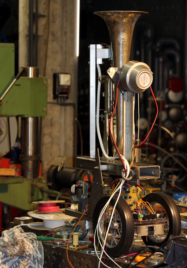 Voor de bouw van deze robot, vertrokken we van een antieke originele tenor saxhoorn uit de ateliers van Charles Mahillon in Brussel. Dat instrument hadden we ooit eens op de Gentse rommelmarkt gekocht voor gebruik in ons vormingswerk gericht op vrije muzikale expressie, de toenmalige Filharmonie van Gent. Toen we het instrument opnieuw uit onze verzameling opdolven in februari 2024 bleek het nog steeds in een redelijke staat te zijn en bovendien ook volstrekt bespeelbaar. Er moeten ooit - na WO2 vermoeden we- wat buisjes aan omgesoldeerd zijn, want de stemming La 440Hz bleek helemaal korrekt, wat gezien de geschatte leeftijd van het instrument, zo goed als uitgesloten is. We hadden eerder 455 Hz of 430Hz verwacht.