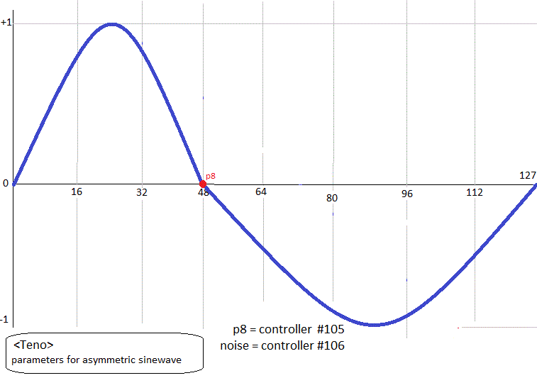 Controller 105: parameter for setting the symmetry when Waveform has been set to 9 (dirty asymmetric sine wave) .Value 64 makes a symmetric sinewave. Valid values are between 1 and 126. The graph illustrates the parameter: