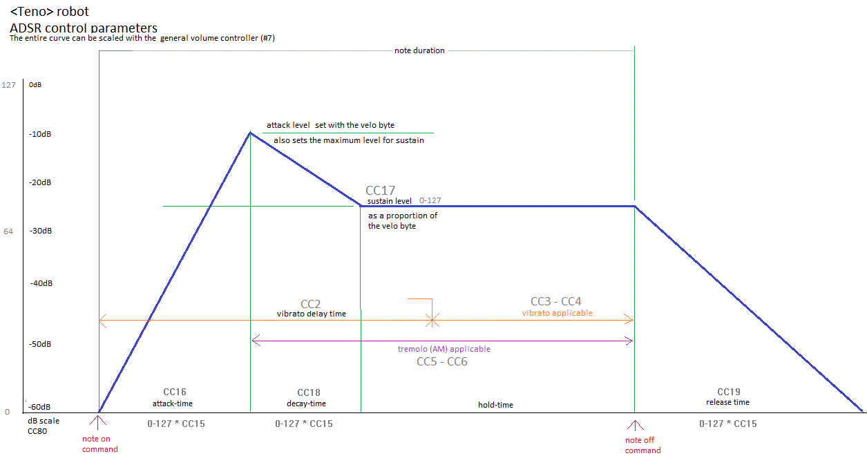 Note that increasing the value of controller 80 and thus the dynamic range does not make the sound volume at its maximum any higher! The dB mapping steers the dynamic range, starting from the absolute maximum. So, if set to 64, corresponding to 40dB, the loudest and the softest volume levels will relate to each other as 100. Or, dynamic value 1 will be at -40dB compared to the maximum value 127. Here the maximum value is defined as 0dB. Note that changing this controller affects all amplitude related parameters, including the ADSR and the tremolo.