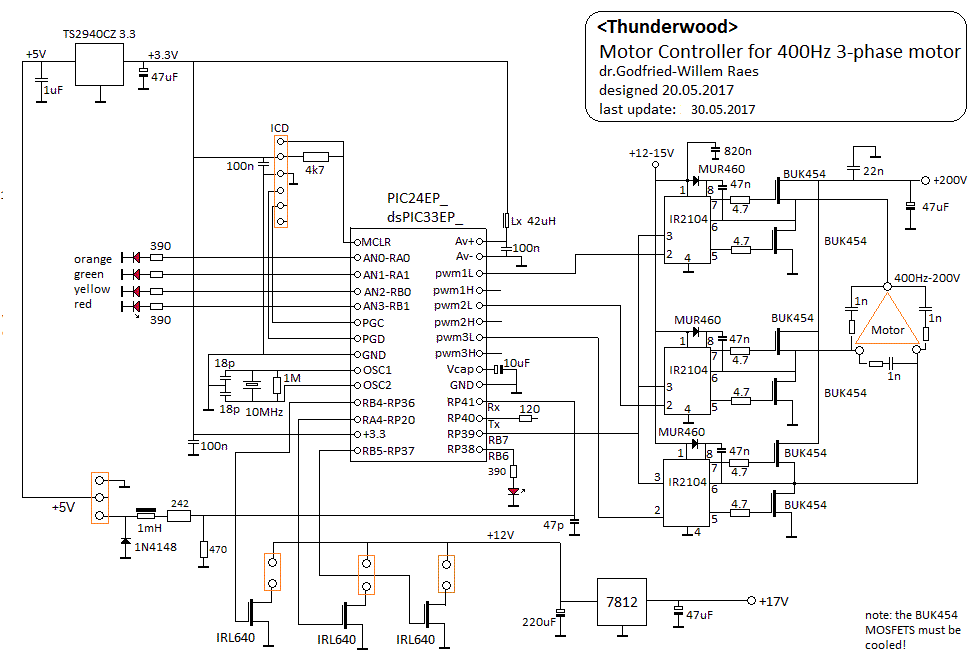 19.05.2017: One of the power MOSFETS in the stormwind motor went to heaven...Repair or redesign the circuit? Looks like a redesign using a PIC 24F motor controllers would be the best repair. This was the old circuitry:![]()
