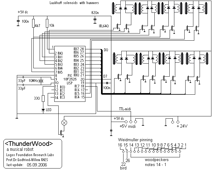 The <ThunderWood> robot uses dedicated hardware, designed for musical automata such as player pianos, percussion instruments, organs and even bowed instruments. Details can be found in our course on experimental music as well as in the descriptive webpages on our many other robots on this same website. A general article 'Expression Control in Musical Automates' covers the many aspects of the design in depth.