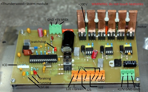 09.10.2006: wiring bug on storm motor board killed. IRL640 mosfet replaced. Software bug in PIC code 3-phase generator killed as well. Now PIC firmware version 1.1 on midi hub board.