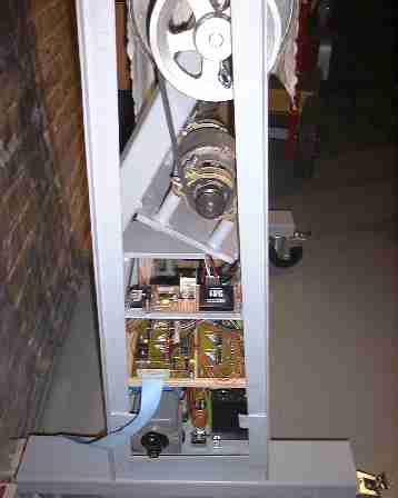 The power supply is kept very simple and consists of three hefty building blocks, mounted on the base of the automate on the right and the left side. Two small size SMPS modules take care of the required +5 voltages for the processor boards. Note that this power supply delivers a bunch of different voltages. Very thick wiring was used for the lower voltages since we are dealing with pretty high currents here. (At times up to 20 Amps!). The somewhat strange looking power supply with the toroidal transformer can be explained because we modified an existing Velleman power amplifier supply with split voltages, to serve for this new purpose, by connecting both windings in parallel. As the capacitors in 2012 exploded, we changed the circuitry and disposed of the original circuit board altogether.