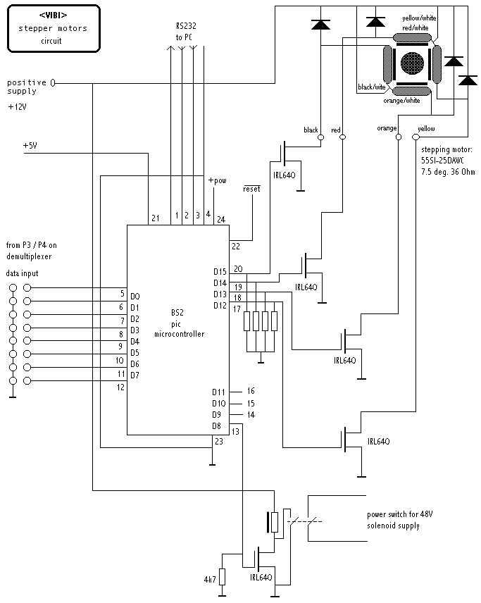 The resonators, as usual on a vibraphone, have a rotating mechanism allowing them to be periodically opened and closed. Each row of resonators has its own rotating shaft. So we provided 2 stepping motors, such that rotational speed of upper row and lower row can be controlled independently over a wide range. To achieve this we used the two 8-bit auxiliary ports on our demultiplexer board to controll two PIC microcontrollers. Thus the software could suffice by sending a byte (0-255) to control the rotation speed of the motors. The code, microcontroller basic, for the PIC's can be found in our Stamp directory. The circuit we developed for these controllers is quite simple: