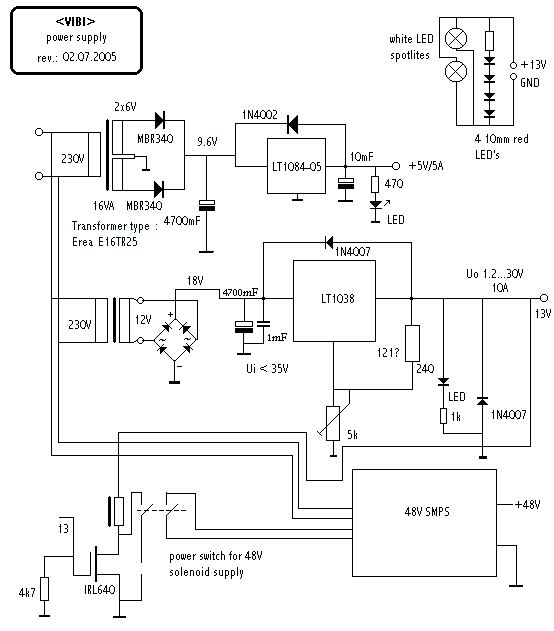 The first power supply is a caged SMPS rated at +5V/15A and +12V/2.5A. It is mounted on the left side of the circuit boards assembly plate, next to the velopulse boards. The -5V/1A is not used in our application. A 110/220V primary switch is provided on the board. There is a 1W 560Ohm resistor between the +5 and ground. This is the minimum load required for operation. Do not remove this resistor. The +5V can be trimmed with the potmeter. Adjust it with all load connected to exactly 5.00V. The +12V output is only used to power the two stepping motors on the instrument as well as the relais circuit to activate the second power supply, such that this voltage comes up only after reception of the appropriate pincode through the GMT software. As a consequence, whenever the power is cut on the instrument, users will have to bootup again (quit and restart GMT with the vibi application, or power down completely and restart, if the midi-in board is installed).