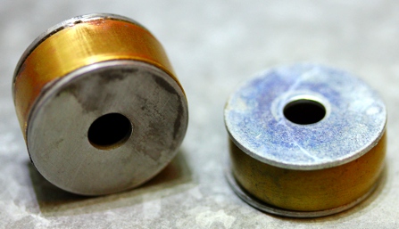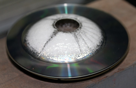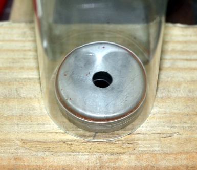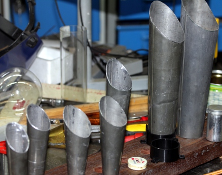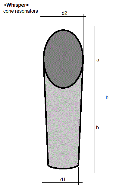 We started off by constructing a wide variety of cavity resonators. We even tried to use obsolete CD's... The orifice formed by the CD center hole is way too large for applications using very low wind pressure and flow though. It works fine with a large radial compressor. Small flat cans gave good results and had a quite wide pitch range under varying pressure conditions:The addition of a conical of even cylindrical secondary resonator increased the sound level quite a bit, although it greatly influences (and limits) the pitches obtainable. After a lot of experimentation we decided to construct these conical resonators with the large end cut under an angle of 45 degrees, this to make the resonant frequency less pronounced. These cones were made from a tin-lead alloy as used for organ pipes. The cavity resonators were glued inside the tapered end of the cones. We made stainless steel flanges to mount the resonators and their cones on the windchest.