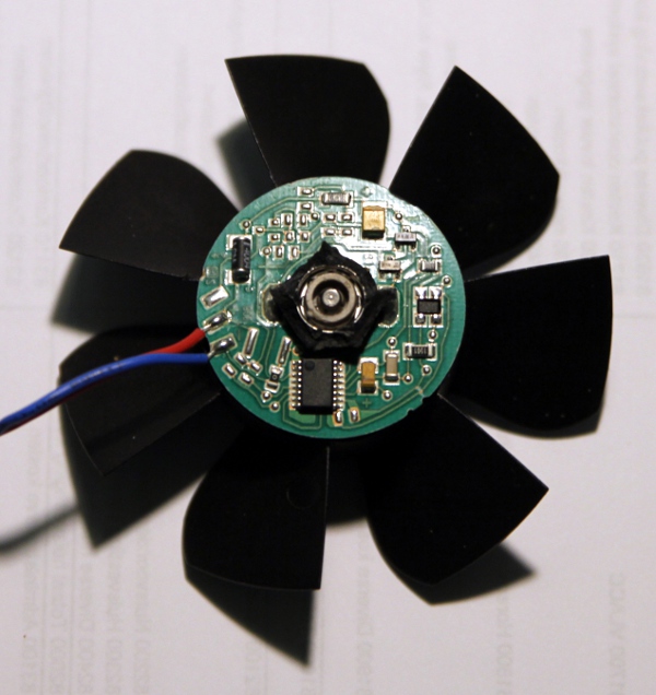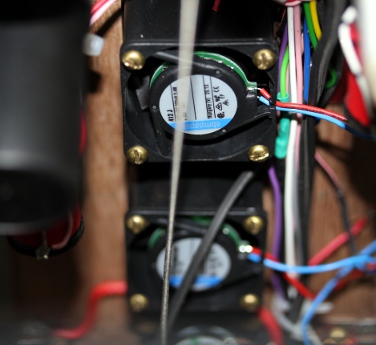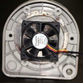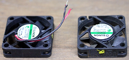 In our design for a robot based on cavity resonators, we started from a box full of small Sunon fans used for cooling electronic components. We had assembled quite a lot of them over the years as in our designs for robotic instruments we systematically removed fans from circuits, for they make a lot of extraneous noise. These little fans work on a 12 V DC voltage but they easily can withstand 16 V as we found out. They typically produce turbulent air at very low pressure.It should be noted that this instrument works on suction wind! We have no clue as to what explains the fact that suction wind works better, given the inherent symmetry of the resonators. (Note: In 2015 we changed all fans for more sturdy types, as we found them all burned one day...)