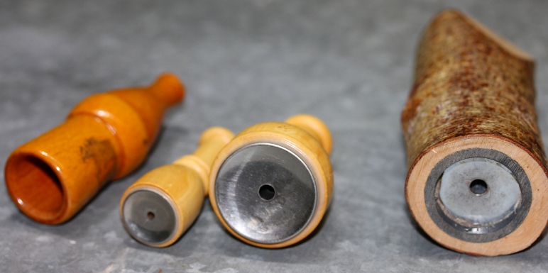 This robot was designed to be very silent. It's sound production is based on the cavity resonator, a somewhat strange device known in acoustics. In daily life people may have run into such sound generators as they are often used as a whistle on some water cookers. They find extensive applications in bird calls of different kinds and in quite a few toys (rubber ducks) and simple toy instruments. Here is a small display of bird calls from our collection, all based on the cavity resonator: All these are designed to be blown (or suck) with the mouth. From an acoustical point of view cavity resonators at first sight appear to be Helmholtz resonators: there is a cavity of air and two orifices on opposing sides of the cavity. However, the math around them developed by Herman Helmholtz around 1860 and later refined by Walter Rayleigh does not seem to apply here. Properly speaking a Helmholtz resonator ought to have a single well defined resonant frequency lacking overtones, whereas the cavity resonators under consideration here operate over a range of more than an octave and produce a manifold of non-harmonic sounds and noises, including multiphonics. The main reason for this behavior seems to be that our resonators are driven by turbulent air of very low pressure and hence the dominant sounds produced are edge tones around the orifices. It is known from organ pipes that the frequencies of these edge tones are highly dependent on applied wind pressure.