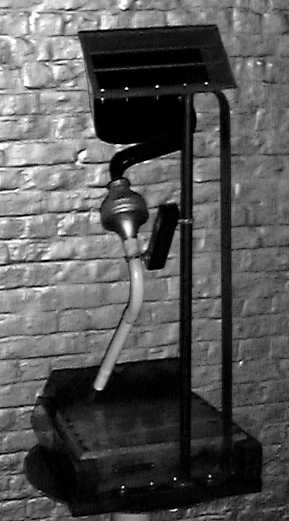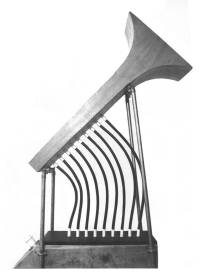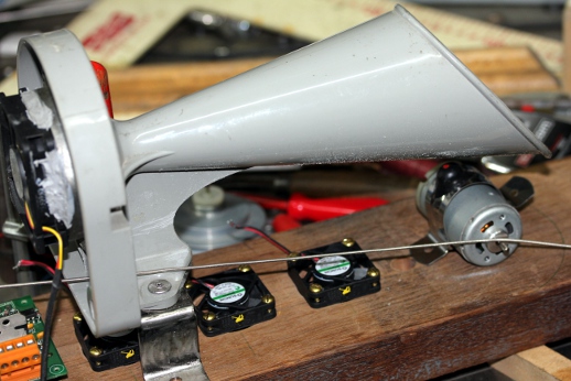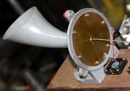 The rubbed string component is based on the same sound generation principles underlying Luigi Russolo's Intonarumori. He used a crank driving a wheel over which a piece of gut string (the tension could be controlled with a hand lever) was led. The other side of the string being attached to a membrane connected to an amplifying horn, a linear cone in most of his instruments. In our design we used a metal membrane coupled to a flared cone taken from an old alarm buzzer. The crank with wheel in the Russolo design, was replaced by a small high torque Johnson motor powered by a variable DC voltage