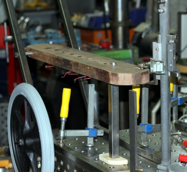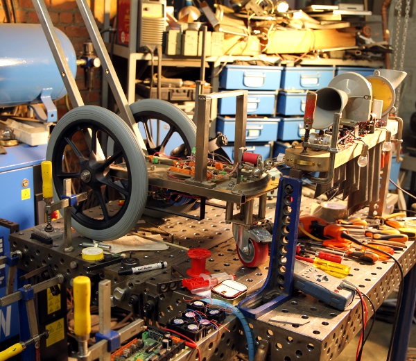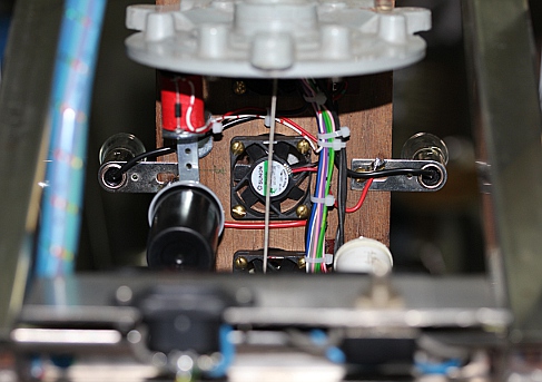 On the front of the robot, we mounted two cast bronze sleigh bells activated by a somewhat larger Laukhuff solenoid. This was designed such that on reception of a note on command, the armature holding the bells will resonate mechanically. The sound of these bells is more or less defined and corresponds to midi note 104 (G#).