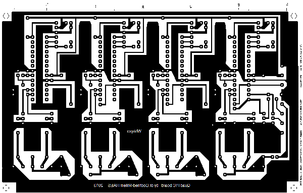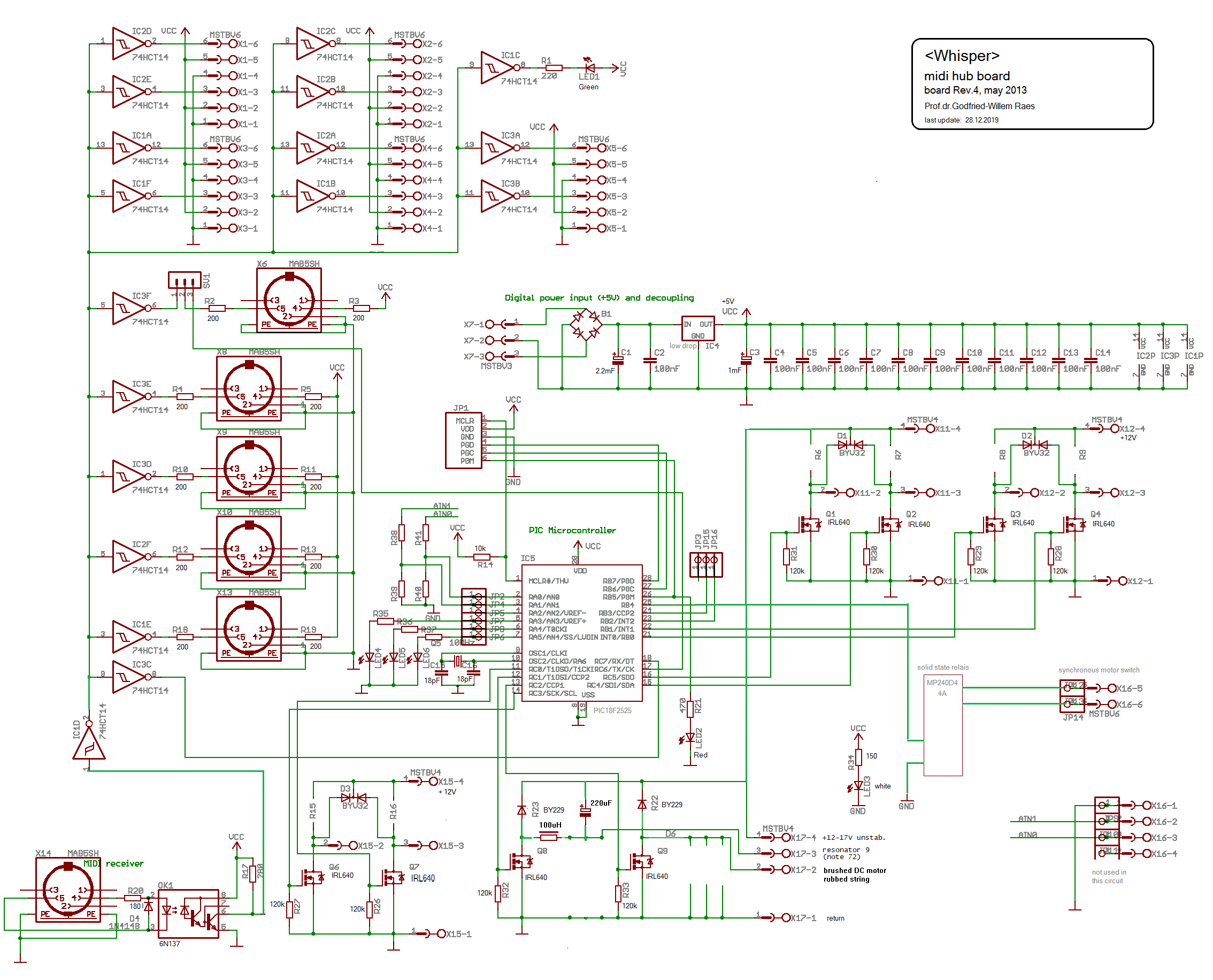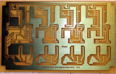 From an electronic point of view, driving 8 small DC motors is a problem we already encountered and solved at the time when designing and building our <Sire> robot. Hence we could use the same microcontroller board in this project. The circuit using a single 18F2525 PIC microcontroller as well as four dual H-driver chips can be found on the webpage describing the <Sire> project. However, as things turned out, the firmware for that board, using only a single PIC processor, caused audible PWM based artifacts from the fan motors. In the <Sire> project, this came unnoticed as the sirens are pretty loud themselves. Thus we decided to design a new PCB from scratch. As our favorite 8-bit PIC controllers have only two hardware PWM outputs on board, we used four microprocessors to steer eight fan motors. Thus it became possible to use above-audio frequencies for the PWM and getting rid of audible artifacts. The circuit -repeated four times on the PC board- , after a long time of experiments and failures, came out like this: