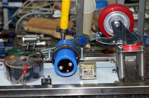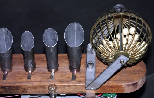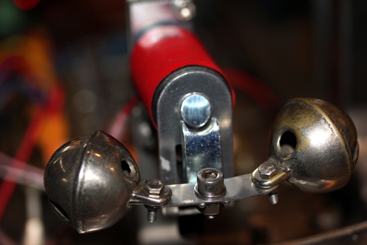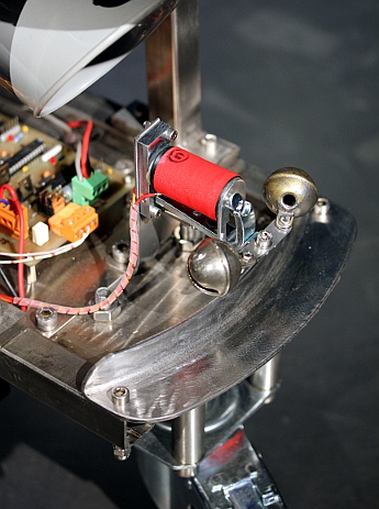 Verder werd deze robot nog voorzien van drie kleine maracas gemaakt met twee 35mm fotoblikjes en een pillendoosje, gevuld met wat lood of ijzergranulaat. Deze maracas worden bestuurd door kleine Laukhuff kleplichtermagneten. Helemaal vooraan op de automaat monteerden we twee op een veerkrachtig beugeltje bevestigde bronzen rolbellen, bestuurd door een wat grotere Laukhuff elektromagneet.