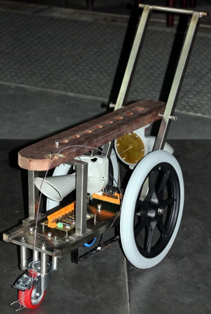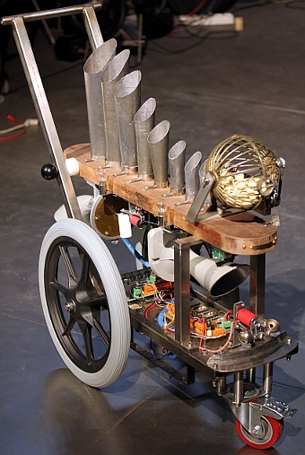 The three small shakers on this robot were made from empty 35mm film cans filled with iron or lead granules. The shaking is activated by A.Laukhuff pallet lifting solenoids.