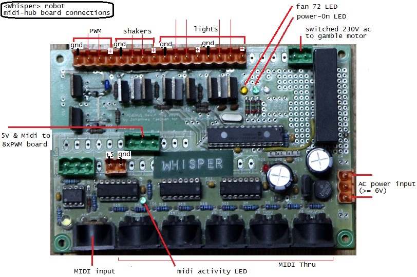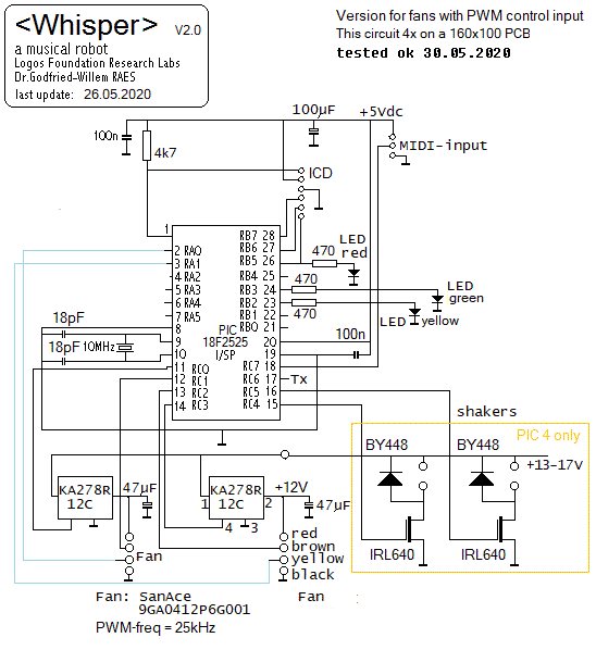 For future designs -and for eventual further repairs of this Whisper robot- we better go for the Sanyo SanAce40, type 9GA0412P6G001 types in combination with the circuit and PCB made and designed 05.2020. Note that these fans make use of a separate lead for PWM speed control. For note 72 the Papst 8412N/2GHP can be used as it has a PWM input wire. The 8412N found burned out in 2016, cannot be used! Note that for the Papst 8412N/2GHP the PWM range , using 7 bits for MIDI compatibility, is limited to the range 11 - 127.