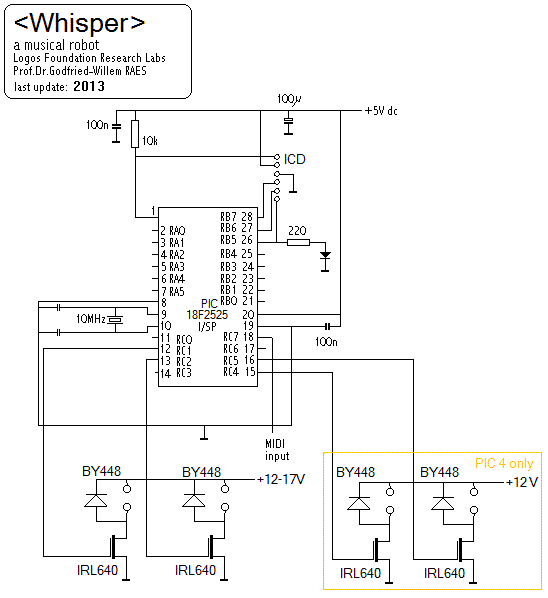 Omdat ons vaak wordt gevraagd hoeveel werk en tijd kruipt in, en nodig is voor, het bouwen en ontwikkelen van een muzikale robot, hebben we ook voor <Whisper> een beknopt bouwdagboek bijgehouden. Omdat we de bouw tot in de laatste details graag illustreren, kan het ook voor anderen die ons op dit pad willen volgen en/of verbeteren, van praktisch nut zijn. Dit bouwdagboek is uitsluitend in het engels beschikbaar, gelet op de grote internationale belangstelling voor onze projekten inzake muzikale robotika.