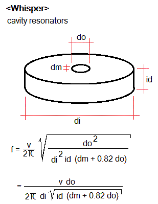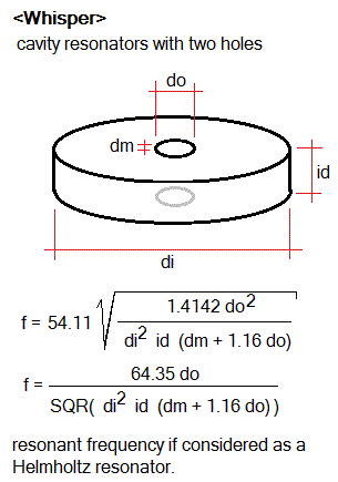 The calculated resonance frequency in this table was calculated using the textbook formula f = (v/ 2¶) SQR( r/V.L), wherein v= velocity of sound, r= surface of the orifice, V=volume of the cavity, L= lenght of the neck, or thickness of the material in this case with the endcorrection added. However, the observed frequencies (without the cones mounted) from these resonators bare very little relationship to these calculated results.