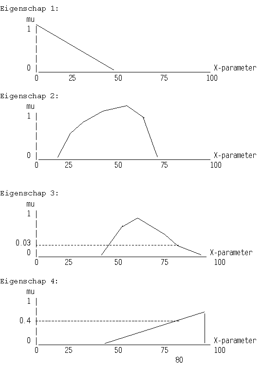 De mate waarin een eigenschap (fuzzy-value) aan een parameter (crisp-value) kan worden toegeschreven, kan nu voor elke eigenschap die met betrekking tot de betreffende parameter als relevant kan worden beschouwd vastgelegd worden in een voor elke eigenschap specifieke kurve. Veronderstel dat we voor een parameter vier eigenschappen menen te moeten en kunnen onderscheiden, dan zou dit kunnen leiden tot vier verschillende kurves: