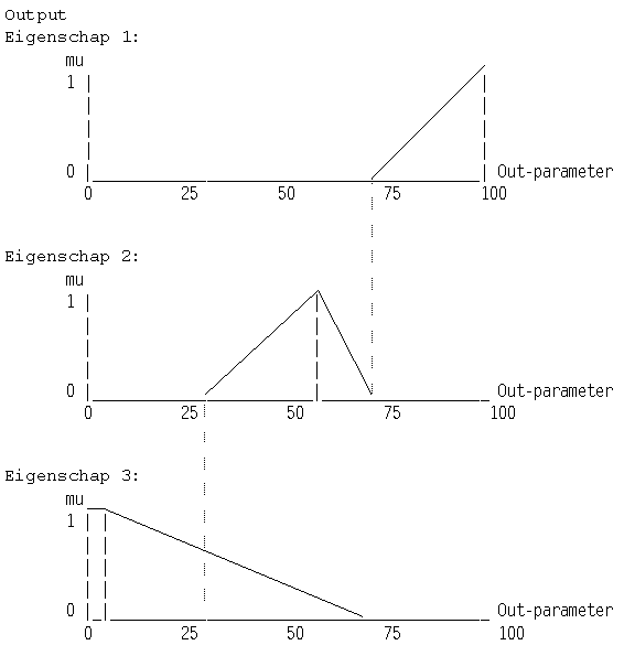 De toewijzing van True of False aan de output-eigenschappen bepaalt welke out-eigenschap kurves we zullen gebruiken bij de berekening van de output- parameter waarde. De formulering van de regels volgt vrij nauw de wijze waarop we de werking van het systeem in woorden zouden beschrijven. De goede werking van het systeem staat of valt uiteraard met de juistheid van deze beschrijving. Vergeet ook niet, dat elke keer we het regelsysteem toepassen, de Out- eigenschap waarden False moeten zijn!.
