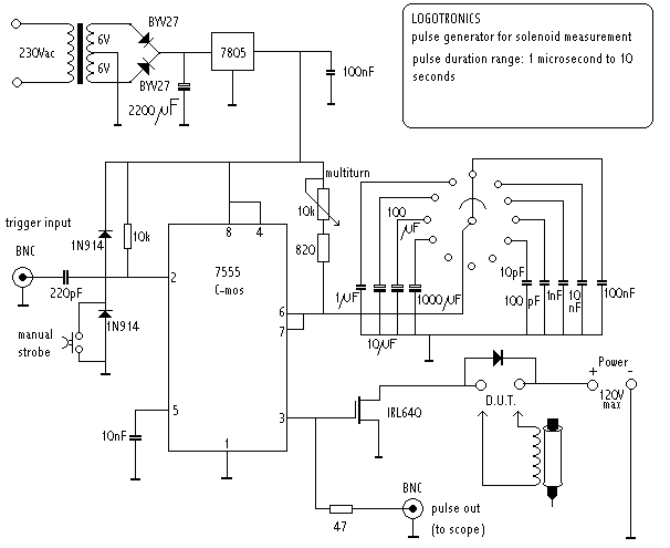 The trigger input gets its signal from a low frequency pulse oscillator (set to 1Hz to 5Hz). You can also cause a single pulse by pushing the button. (Note that we did not provide a debounce circuit, for simplicity). The frequency of the trigger signal should obviously be lower then the period set for the pulse. Otherwise the monoflop will retrigger and consequently the output will be high all the time. The trigger input circuit includes a capacitor functioning as a differentiator and limiting the trigger pulse to ca. 4µs. This way the circuit can also be triggered with AC signals. The test voltage for the solenoid is applied over the indicated contacts. We strongly advise the use of a bench lab power supply (0-60Volts, 0-6A) with readings for voltage and current as well as a current limiting control. The multiturn 10k potmeter (Bourns) allows us to set the pulse length with great precision. When the 1 µF cap is selected with the 12-position rotary switch, the range of the pulse duration can be set between 900 µs (microseconds) and 11ms (millisecond). With each change of capacitor, we shift the range a decade up or down. We can read the values from an oscilloscope connected to the pulse output. Digital scopes (Fluke) are particularly suitable to this end, since they allow precise pulse measurements to be made. It is advisable to use low leakage MKM capacitors for the ranges requiring stability and precision (10µF, 1 µF, 100nF) and styroflex for the lower values. (2)