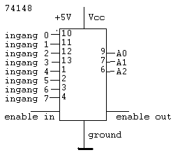 Deze chip werkt met negatieve logika. Ingang 7 heeft de hoogste prioriteit. Wanneer deze ingang 0 wordt ( bij negatieve logika komt dit dus overeen met waar ), dan verschijnt op de A0-A2 uitgangen de binaire code 000, onafhankelijk van wat dan ook op de andere ingangen staat. Ingang 6 in ondergeschikt aan ingang 7: op de uitgang verschijnt de binaire code 001 dan en dan alleen als ingang 6, 0 is en ingang 7 niet ook 0 is ( m.a.w. 1 is).