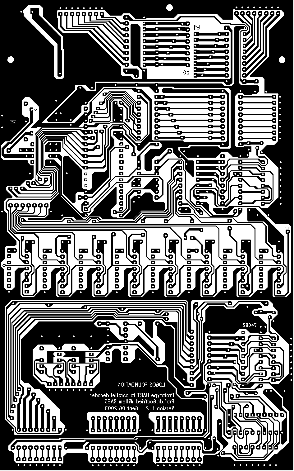 The design as presented and tested decodes one 3 byte message, such as note on + velo as well as one 2 byte message, such as program change. The message to which the circuit should react by storing the corresponding data bytes, can be user selected with the binary DIL switches. Note that in the practical realisation, we used discrete transistor invertors instead of TTL inverted as drawn in the circuit. This was done only for board layout considerations.