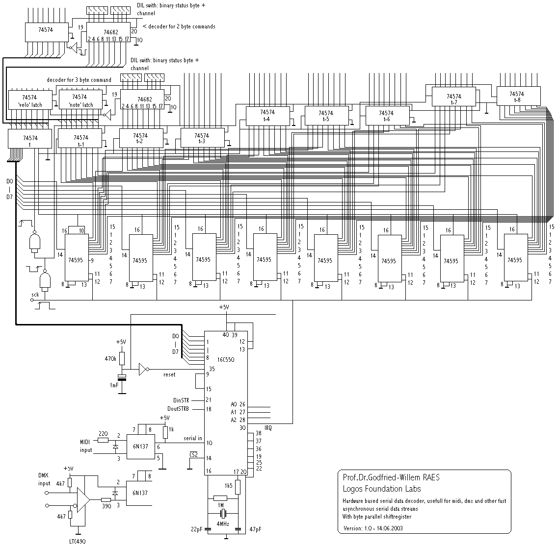 The first problem we encounter in the design is that the midi data stream always has the status byte followed by one or two byte. If the data would precede the status byte, the circuitry would be a bit easier. To solve this we decided to shift all incoming bytes continuously in an 8-step shift register. The 74595 chips, each of them handling a single databit, perform this job. In the schematic drawing we recombined all these serial bits back to 8 single bytes using 74574 latches. Since the shift registers lag the incoming data stream by one byte, we used a separate latch for the most recent byte. Thus in total we can go as far as decoding up to 9 bytes. That would only have applications in the area of sysex's and non-standard midi designs, but we show the principle for completeness sake.
