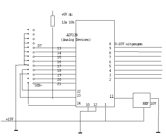 Een volstrekt identisch probleem stelt zich wanneer we een komputer zouden willen gebruiken om een analoge spanningsgestuurde synthesizer mee te kontroleren. Ook dit type synthesizer maakt veelal gebruikt van stuurspanningen in het bereik 0- +10V (1Volt per oktaaf). Veronderstellend dat we liefst geen ingrepen in de komputer zelf willen uitvoeren en dat we ons er liefst zouden toe beperken te volstaan met de op elke komputer -inklusief laptops- voorhanden zijnde I/O aansluitingen, dan ligt het gebruik van de parallelle printerpoort uiteraard voor de hand. Naast de 8 databits, biedt deze poort ons nog 4 extra bits (op het basisadres, dat we hier voor de eenvoud bepaalden op &H378, + 2) die als output bruikbaar kunnen zijn: