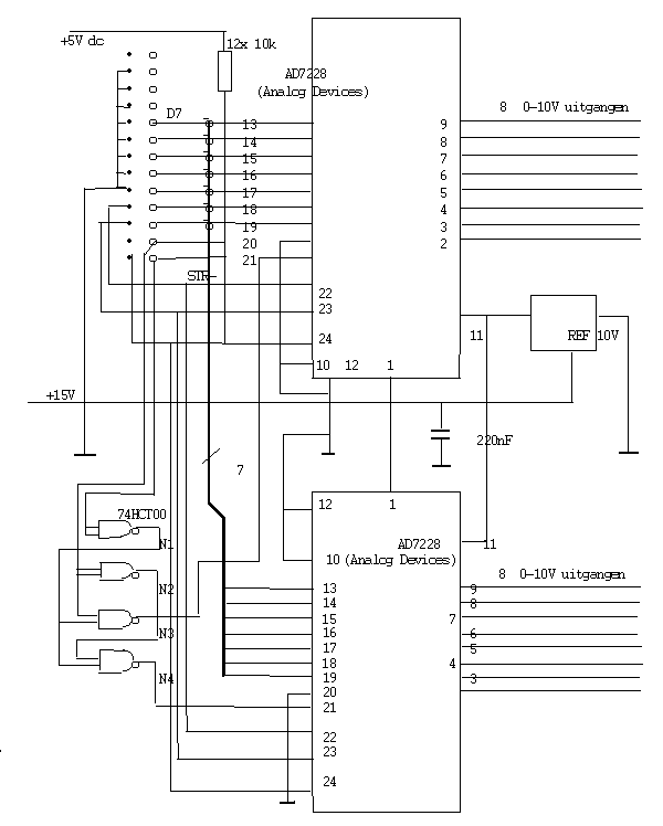 Eens de nodige voedingsspanningen aangesloten (+5V voor de pull-up weerstanden op de poort, de referentiespanning van 10V die we bij voorkeur uit een chip-spanningsreferentie kunnen betrekken, en de +15V voor de stroomvoorziening van de AD7228 zelf - te halen uit een standaard 7815 regulator, is de zaak in principe rond. We zeggen in principe want te bezien valt nog of de analoge uitgangsspanningen die de konverter ons nu achtvoudig ter beschikking stelt voldoende onafhankelijk zijn van de aan te sluiten belasting... In het data-sheet van de chip staat immers duidelijk vermeld dat de uitgangen geen lagere belastingsweerstanden mogen zien dan 2kiloOhm en dat ook de op de uitgangen aangesloten kapaciteit de 500pF beslist niet mag overschrijden. Heel konkreet betekent dit bvb. dat we niet ongestraft lange kabels zullen mogen gebruiken: de kapaciteit ervan zou wel eens deze 500pF kunnen te boven gaan. Evenmin kunnen we bvb. halogeenlampen rechtstreeks op onze arme uitgangen loslaten: een 12V halogeenlamp van bvb. 100W heeft een brandweerstand van minder dan 1.4 Ohm, terwijl de weerstand in koude toestand nog heel wat lager ligt. De door ons chipje te leveren stroom dient te worden beperkt tot 10V / 2000 Ohm = 5 mA! Het zal duidelijk zijn dat in vele gevallen een buffering van de uitgang noodzakelijk kan blijken. In geval we onze schakeling voor de sturing van analoge synths willen gebruiken echter, dan volstaat de chip ruimschoots, mits we geen al te lange kabels gebruiken. Patchcords zijn echter zelden langer dan ca.1.5m, wat geen problemen oplevert.