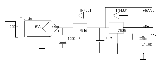 De AD7228-chip (ESD-sensitive, en dus met omzichtigheid te behandelen) plaats je in een voetje, want hij is niet bepaald heel goedkoop... Voor het overige vinden we op de print (2e schema) een 7815 en een 7805 regulator, een brugcel ofwel vier afzonderlijke diodes (1N4002 bvb.) met de gebruikelijke afvlakkondensator evenals de voedingstransformator, waarvoor naast een model voor printmontage, eventueel ook een adapter met aangegoten stekker kan worden gebruikt. Voor de 10Volt referentiespanning maakten we gebruik van een precisie spanningsreferentie van Analog Devices, maar volstaat een goedkopere maar nog steeds redelijk stabiele oplossing, dan kan je ook beroep doen op hetzij een weerstandsdeler, hetzij een kleine schakeling met een weerstand (2k2 bvb.) en een zenerdiode van 10Volt.