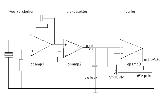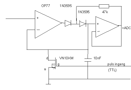 Een bijzonder mooie oplossing voor vele van deze teoretische én praktische problemen, uitgewerkt voor een piekdetektor waarvan de waarde door een komputer via een ADC-konvertor wordt uitgelezen, en waarbij diezelfde komputer via een uit te sturen puls (1 enkel bit) zorg draagt voor de ontlading van de kondensator, blijkt uit bijgaand schema.
