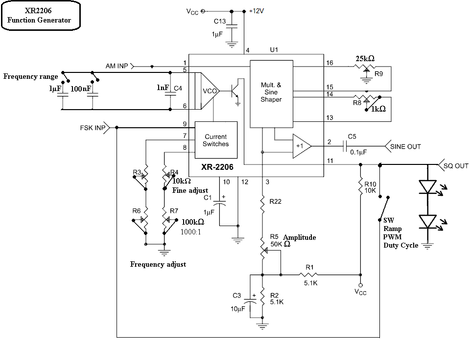 XR2206 - sinus, blok en zaagtandgolven. Hier is een voorbeeld van een erg populaire schakeling: