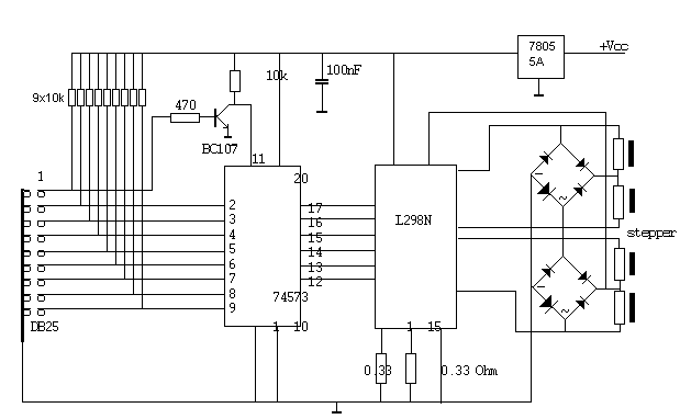 De respektievelijke bits vinden we terug op de DB25 printerkonnector op de komputer : pin 1 is het strobe bit , pinnen 2 tot en met 9 zijn de databits. Hiervan zullen we de bits D0-D3 (pinnen 2, 3, 4, 5) gebruiken voor het bitpatroon dat de motor doet bewegen , en de bits D4 en D5 als 'enable' signalen. De bits D6 en D7 blijven ongebruikt.