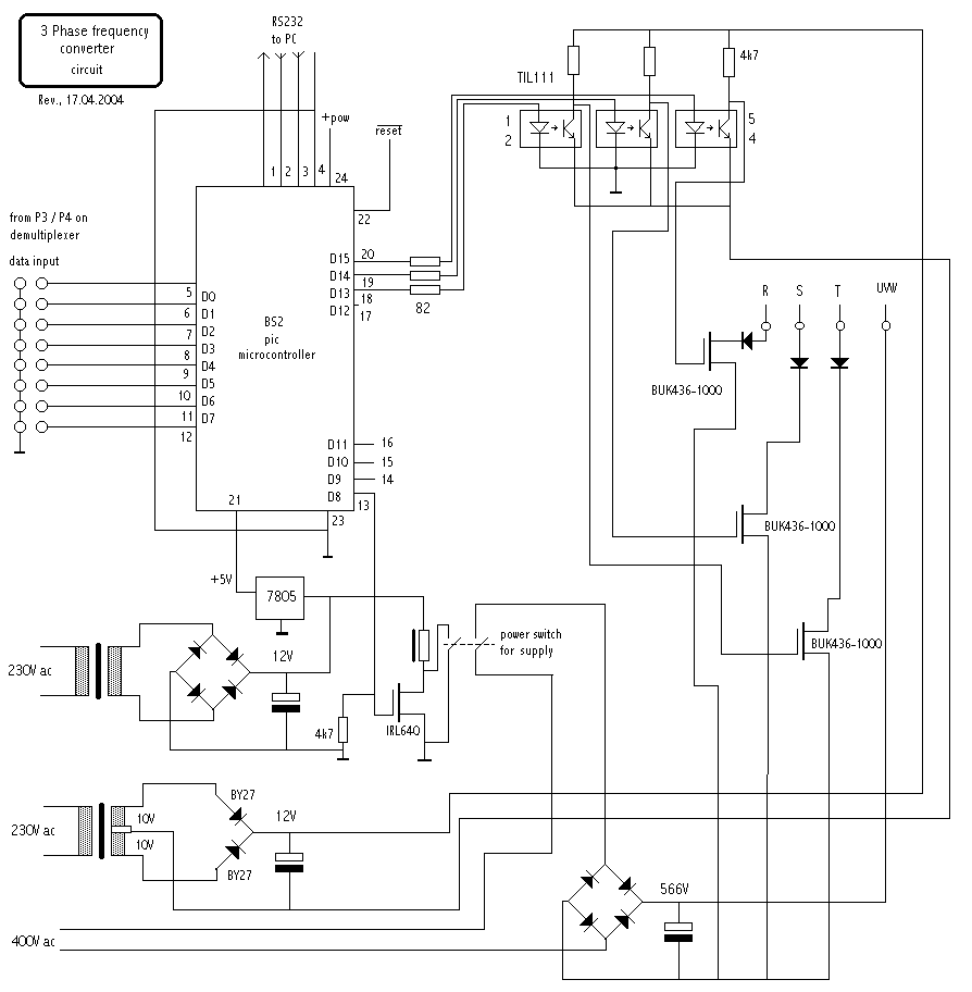 The optocouplers used can be either TIL111 or CNY17-2. Do not try to save on the transformers: these are very small and cheap types (2VA is enough) and the floating way they are connected here (no grounded negative poles!) is essential to this design. Be carefull when playing around with this kind of circuitry, since there are high voltages everywhere. The digital input and the microcontroller are completely and optically isolated from the power circuitry.