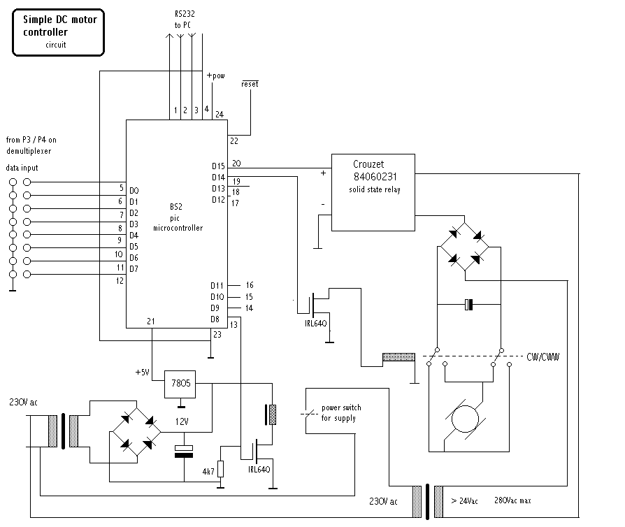 Output pin 19 controls a relais, used to control the direction of rotation of the motor (CW/ CWW). Pin 13 is shown connected to another relais wherewith the complete power circuit for the motor can be switched on or off.