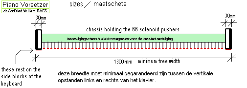 Het hele mekanisme is op deze wijze opgebouwd erg kompakt: de diepte beloopt slechts 10cm, waardoor het ontwerp in principe ook voor orgels en klavecimbels geschikt kan worden gemaakt. Aan beide uiteinden rust het op de blokjes links en rechts naast het pianoklavier. Helaas is dit op oude klavierinstrumenten meestal niet mogelijk, omdat het klavier daar vaak wordt ingebouwd in de kast waarbij er links en rechts van het klavier een opstand ontstaat. Voor oude instrumenten beveel ik dan ook de bouw van een letterlijke 'Vorsetzer' aan: een toestel dat aan het klavier wordt gezet en dat zelfstandig op de grond rust.