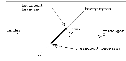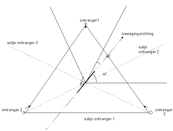 Beschouwen we nu onze opstelling binnen een gelijkzijdige driehoek waardoorheen de beweging plaatsgrijpt en noemen we de bewegingshoeken vanuit elke ontvanger o1, o2, o3, dan a1, a2, a3 dan volgen de diverse frekwenties en hun samenhang uit :