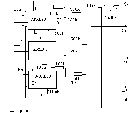 Voor de praktische opbouw van de sensor werd gebruik gemaakt van 3 chips van Analog Devices, ontwikkeld voor gebruik in air-bag systemen in autos. Het elektronische schema is niet veel meer dan een letterlijke toepassing van de application notes zelf. Erg belangrijk is de opstelling van de sensorchips op cartesische koordinaten, zodat we rechstreeks de vektoriele versnelling in X,Y en X kunnen verkrijgen. Het spreekt vanzelf dat de precisie van de rechthoekigheid hier beter moet zijn dan de resolutie van de sensors zelf: dus ca. 0.25%.