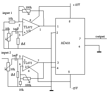Goede exemplaren , d.w.z. precizie multipliers (0.5%) bvb. met een breed frekwentiebereik zijn niet goedkoop! De MPY534 kost zon 6000fr. Neem je vrede met een 2% exemplaar, kies dan AD633 voor zon 700fr. Wil je zo goedkoop mogelijk experimenteren, grijp dan terug naar de historische schakeling en zoek wat geschikte transfos uit oude apparatuur. (Audio ringkern transformatoren zijn ideaal).