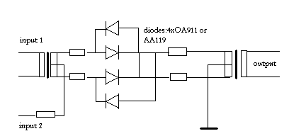 De ingangssignalen voor deze schakeling moeten kleiner zijn dan 25mV, zoniet moeten weerstandjes in serie met de diodes geplaatst worden. De waarde van de weerstandjes moet zo berekend worden dat zij groter zijn dan de geleidingsweerstand van de gebruikte diodes bij de gewenste spanning.