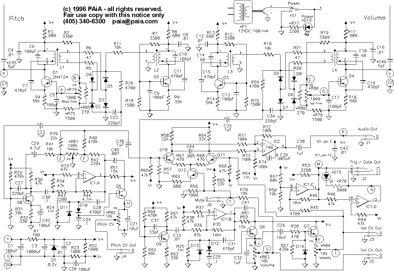 Wie het toch liever wat eenvoudiger wil, kan ook terecht bij de Amerikaanse fabrikant Paia, die in 1996 een Theremin als bouwpakket op de markt bracht. Dit kleine bedrijfje heeft een goede website, waarvan we het volledige schema voor de theremin zoals zij hem ontwierpen konden downloaden.